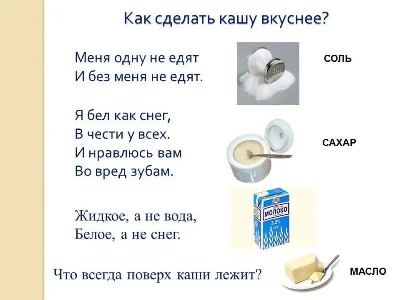 Каши есть полезно, она поможет стать сильными. Только не всегда она бывает вкусно. Угадайте - ка мои загадки, тогда мы назовем с вами все, что для хорошей каши нужно.