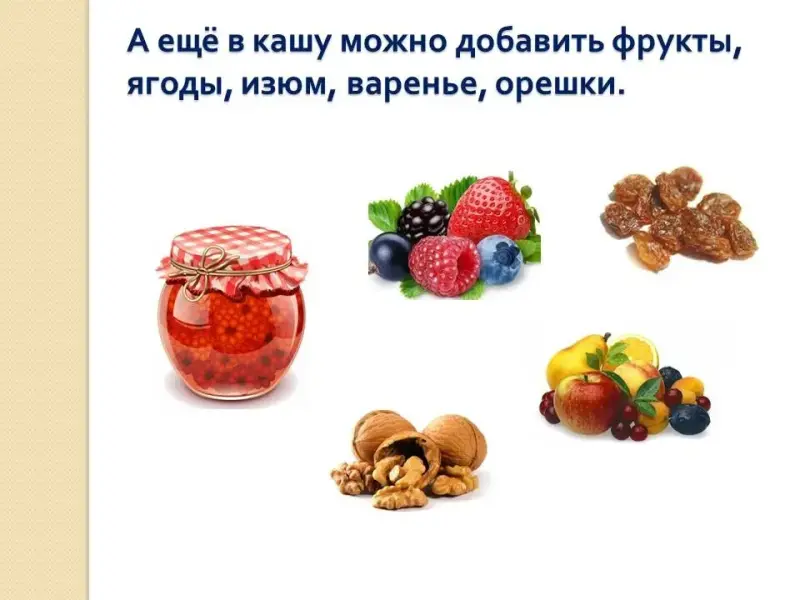 Учитель: Чтобы вкуснее была каша, можно добавить ягоды, фрукты, орехи, изюм, варенье, орехи.