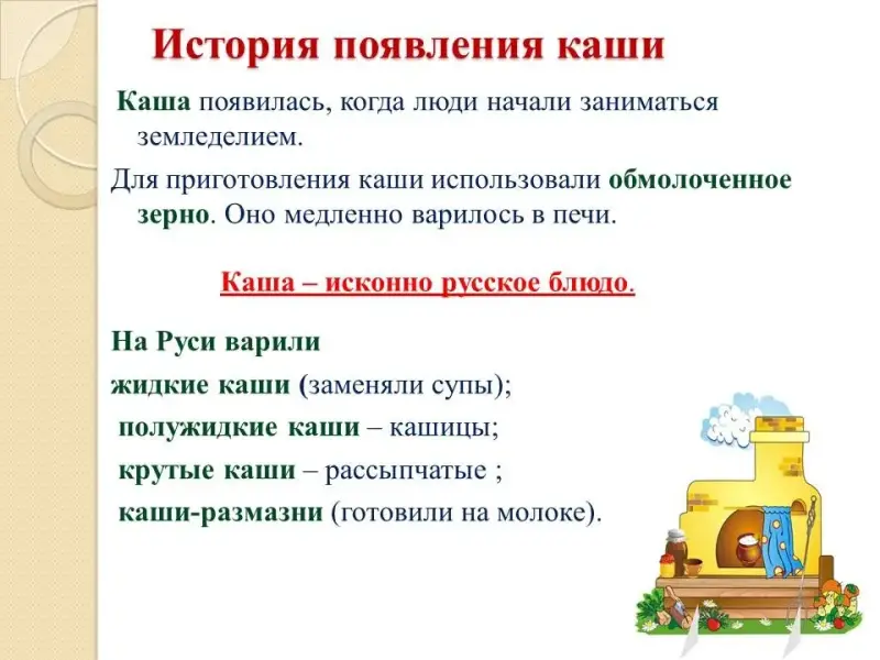 Учитель: Каша появилась, когда люди начали заниматься земледелием. Сначала ели крупу, залитую холодной водой, а потом начали варить её. Для приготовления каши использовали