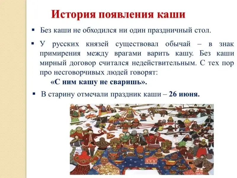 Без каши не обходился ни один праздничный стол. У русских князей существовал обычай - в знак примирения между врагами варить кашу. Без каши мирный договор считался недействительным. С тех пор про несговорчивых людей говорят: «С ним кашу не сваришь». В старину отмечали праздник каши - 26 июня.