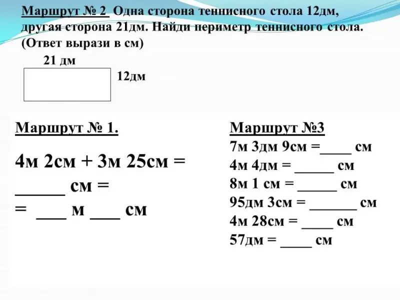 - А сколько видов спорта, и какие вошли в программу школьной Олимпиады? Решите примеры и ответьте на мой вопрос. - При решении, каких примеров вы затруднялись? Почему? - Какое важно правило вы соблюдали при сложении данных чисел? /При сложении единицы складываются с единицами, десятки с десятками, сотни с сотнями/ 8) Обратимся к нашему Олимпийскому вестнику. Добавим виды спорта 9) Итак, математический скоростной спуск. Чтобы добраться до финиша, надо по возможности выполнить задание. Каждый из вас вправе выбрать тот путь, который вам по душе, маршрут может быть лёгкий, а может быть трудный. Маршрут № 1. 4м 2см + 3м 25см =727 см = 7м 27 см Маршрут № 2 "Одна сторона теннисного стола 12дм, другая сторона 21дм. Найди периметр теннисного стола. (Ответ вырази в сантиметрах) Маршрут №3 7м 3дм 9см =____ см 4м 4дм = _____ см 8м 1 см = _____ см 95дм 3см = ______ см 4м 28см = ____ см 57дм = ____ см ПРОВЕРКА ПО ЭТАЛОНУ |