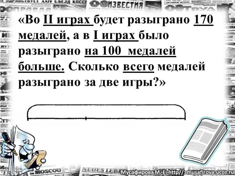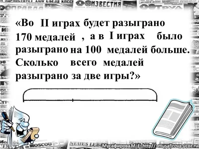 "Во II играх будет разыграно 170 медалей, а в I играх было разыграно на 100 медалей больше. Сколько всего медалей разыграно за две игры?" - Анализ задачи. Заполнение схему и запись решения в тетради. |