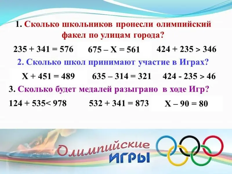 - А знаете ли вы, сколько школьников пронесли олимпийский факел? Сколько школ принимают участие? Сколько будет разыграно медалей в Играх? - Я предлагаю Вам решить уравнения и ответить на вопросы. Решите и узнайте. (По рядам, подчеркивание нужного уравнения) 1 группа. Сколько школьников пронесли олимпийский факел по улицам города? (114) 235 + 341 = 576 675 - Х = 561 424 + 235 ? 346 2 группа. Сколько шахтинских школ принимают участие в Играх? (38) Х + 451 = 489 635 - 314 = 321 424 - 235 ? 46 3 группа. Сколько будет медалей разыграно в ходе Игр? (170) 124 + 535 < 978 532 + 341 = 873 Х - 90 = 80 5) Физкультминутка (на столах карточки с числами) Игра "Мои друзья" (ТРИЗ компонент). Дети, чья модель подходит к высказыванию, выходят к доске и демонстрируют записи на листе. Если ученик вышел неправильно, то сразу проводится коррекция знаний самими учащимися.