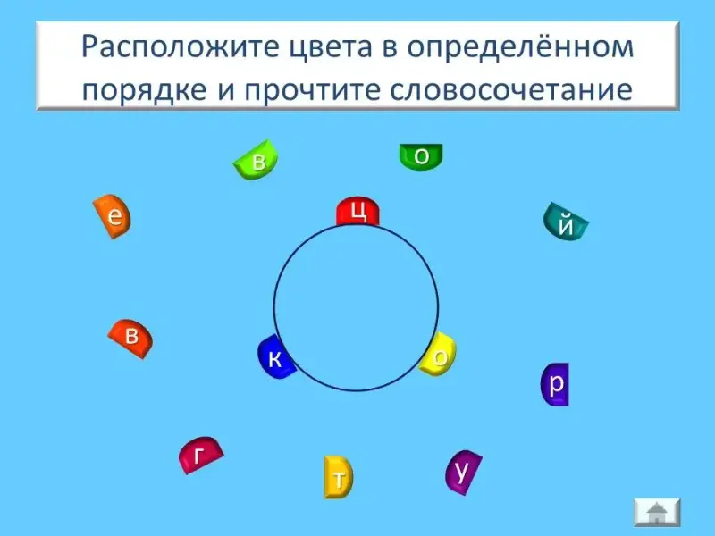Учитель напоминает им, что цветовой тон позволяет дать цвету название, например, «красный», «жёлтый» и т.д. Учащиеся демонстрируют свои знания, полученные на уроках изобразительного искусства. Они называют три основных цвета, составные цвета, образованные при смешивании основных цветов. Ребята расставляют цвета цветового круга по порядку, начиная с красного цвета. Все цвета обозначены буквами, из которых необходимо собрать словосочетание. После ответов детей по щелчку хаотично расположенные на слайде цвета передвигаются на своё место. Учащиеся читают получившееся из букв словосочетание: «цветовой круг». Учитель напоминает им, что цвета, расположенные друг против друга в цветовом круге, называются контрастными. Дети составляют возможные пары контрастных цветов этого цветового круга. Учитель акцентирует внимание учащихся на том, что контрастные цвета, помещённые рядом, усиливают яркость друг друга. Он предлагает назвать контрастные цвета, которые использует художник В.Э. Борисов-Мусатов на картине «Маки в саду».