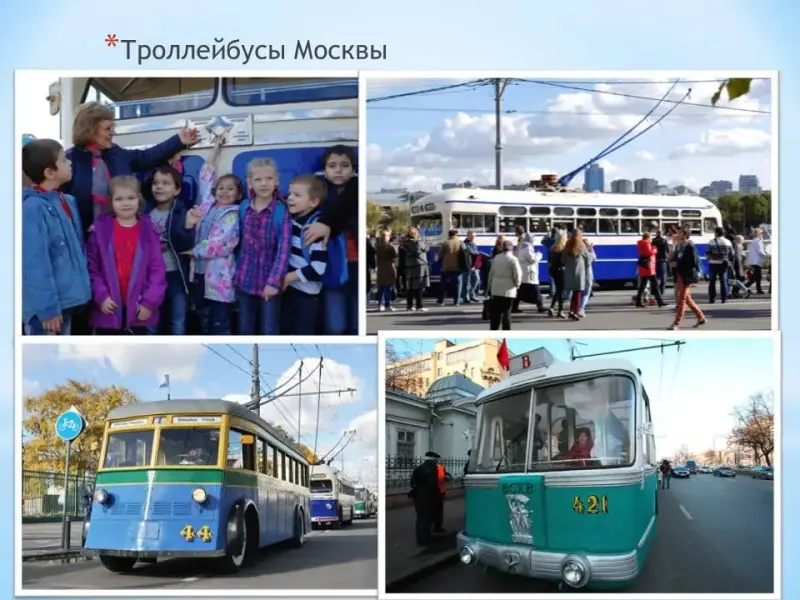 Слайд № 5 В ходе экскурсии мы увидели все виды троллейбусов, которые перевозили пассажиров по Москве. Посмотрели на самый старый троллейбус с деревянными дверьми. Узнали, что по Москве курсировали грузовые и двухэтажные троллейбусы.