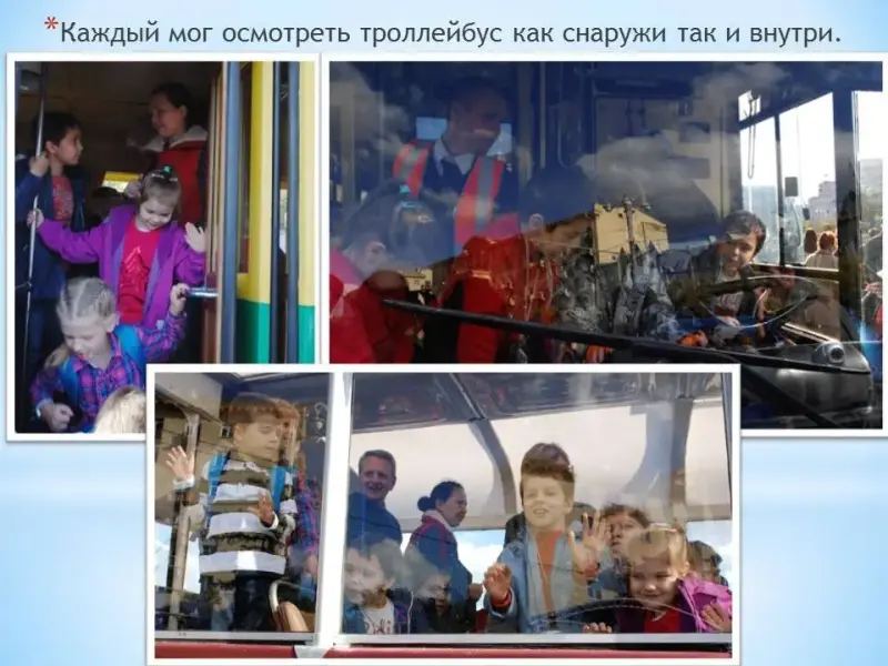 Слайд № 6 Дети не только увидели всё это разнообразие троллейбусов, но и смогли рассмотреть троллейбус внутри, почувствовать себя пассажирами другой эпохи.