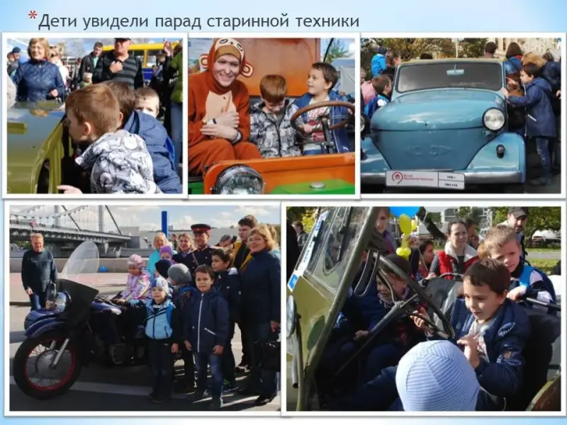 Слайд № 7 Так же ребята увидели парад старинной техники Москвы. Смогли посидеть за рулем старинных автомобилей.