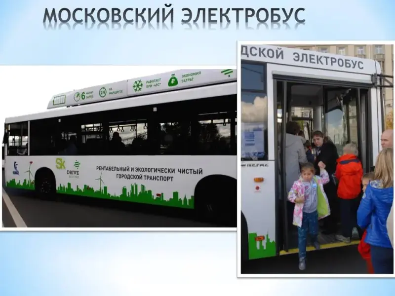 Слайд № 8 В конце путешествия нас познакомили с новым экологически чистым видом транспорта, который скоро должен начать перевозить пассажиров по городу - Электробусом. Мы узнали, что электробус работает на батареях, которые заряжаются всего 6 минут, а работает электробус от такой зарядки весь день.