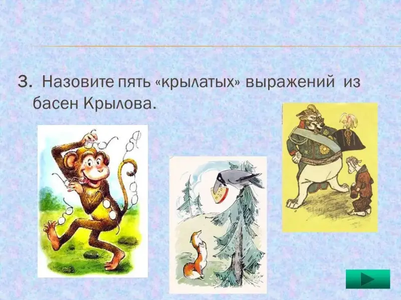 3. Назовите пять "крылатых" выражений из басен Крылова.