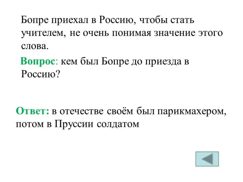 Учитель. Бопре приехал в Россию, чтобы стать учителем, не очень понимая значение этого слова. Вопрос: а кем был Бопре до приезда в Россию?