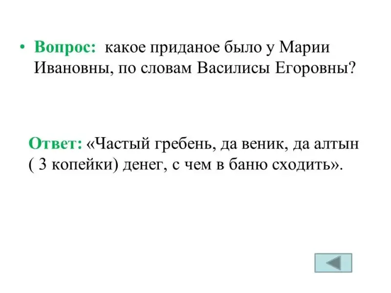 7. Приданое. Вопрос: какое приданое было у Марии Ивановны, по словам Василисы Егоровны?