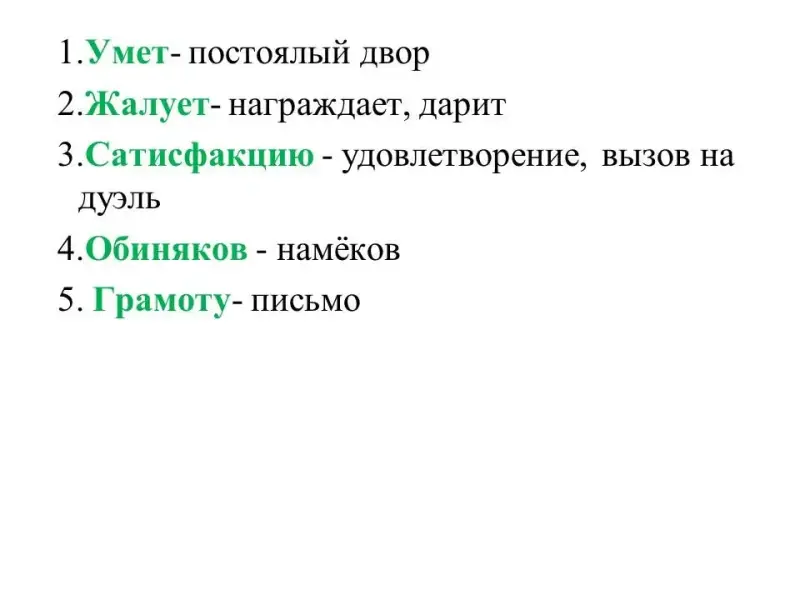 1. Умет - постоялый двор. 2. Жалует - награждает, дарит. 3. Сатисфакцию - удовлетворение, вызов на дуэль. 4. Обиняков - намёков. 5. Грамоту - письмо.