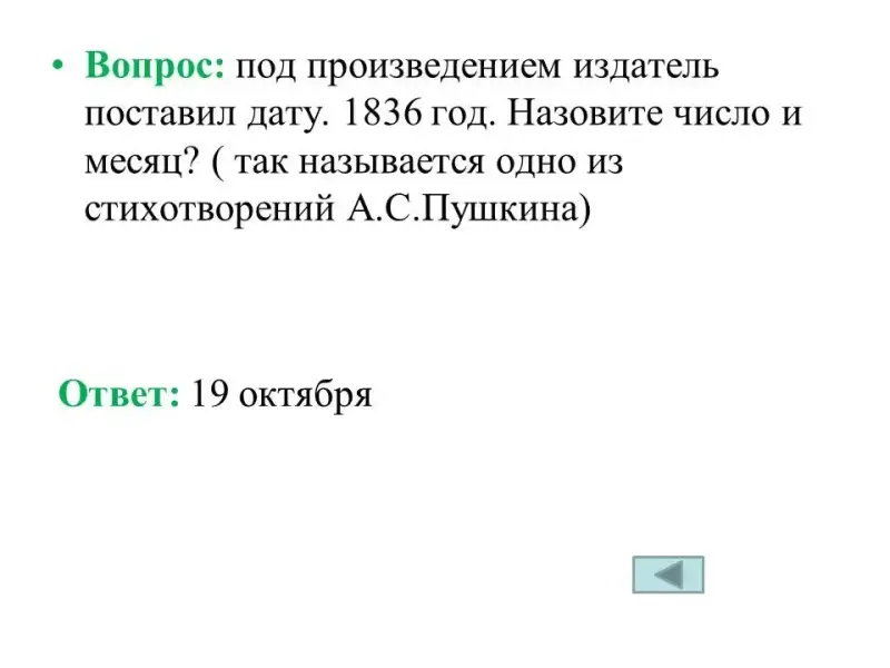 7. Дата. Вопрос: под произведением издатель поставил дату. 1836 год. Назовите число и месяц? ( так называется одно из стихотворений А.С.Пушкина)