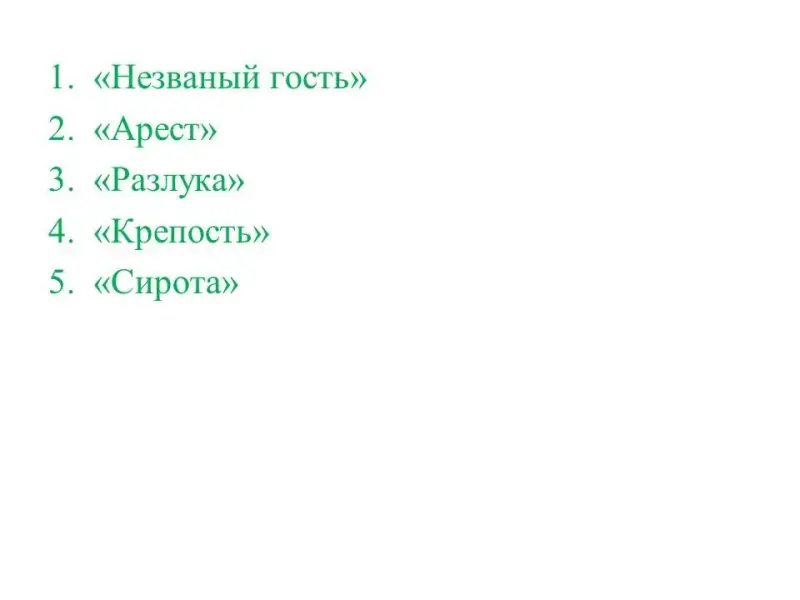 "Незваный гость" 2. "Арест" 3. "Разлука" 4. "Крепость" 5. "Сирота"