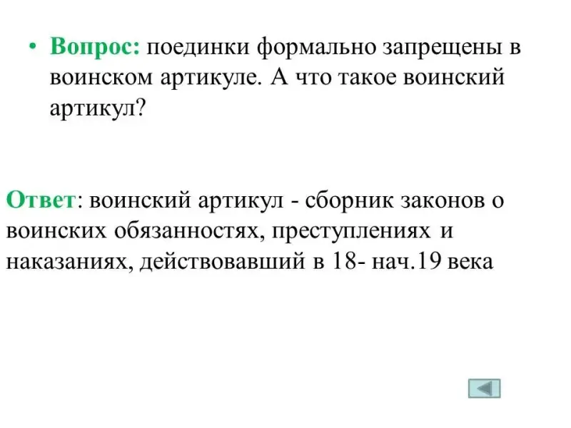 Вопрос: поединки формально запрещены в воинском артикуле. А что такое воинский артикул?