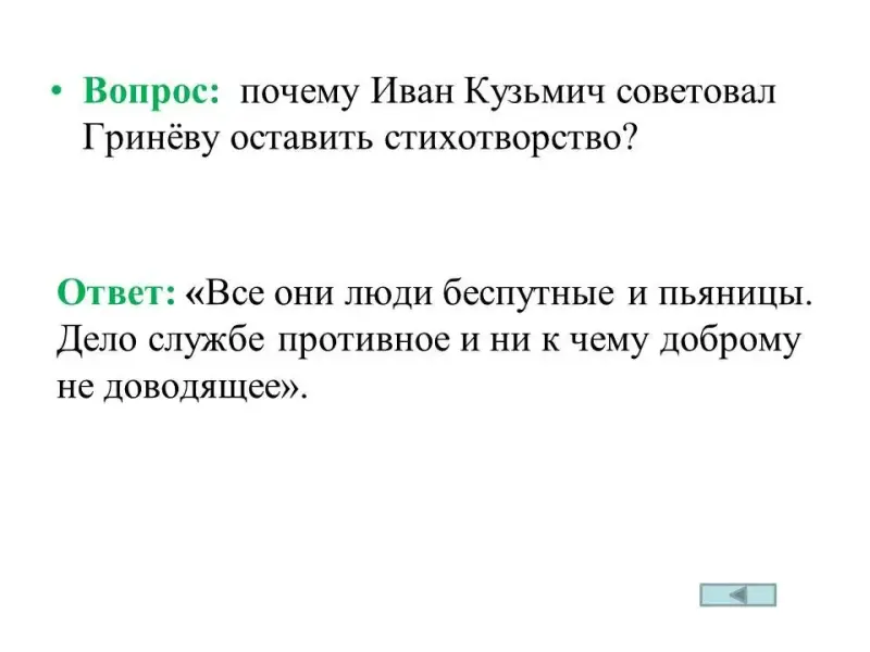 8. Совет. Вопрос: почему Иван Кузьмич советовал Гринёву оставить стихотворство?