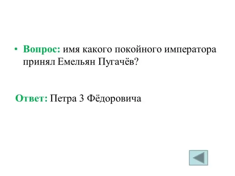 Вопрос: Имя какого покойного императора принял Емельян Пугачёв?
