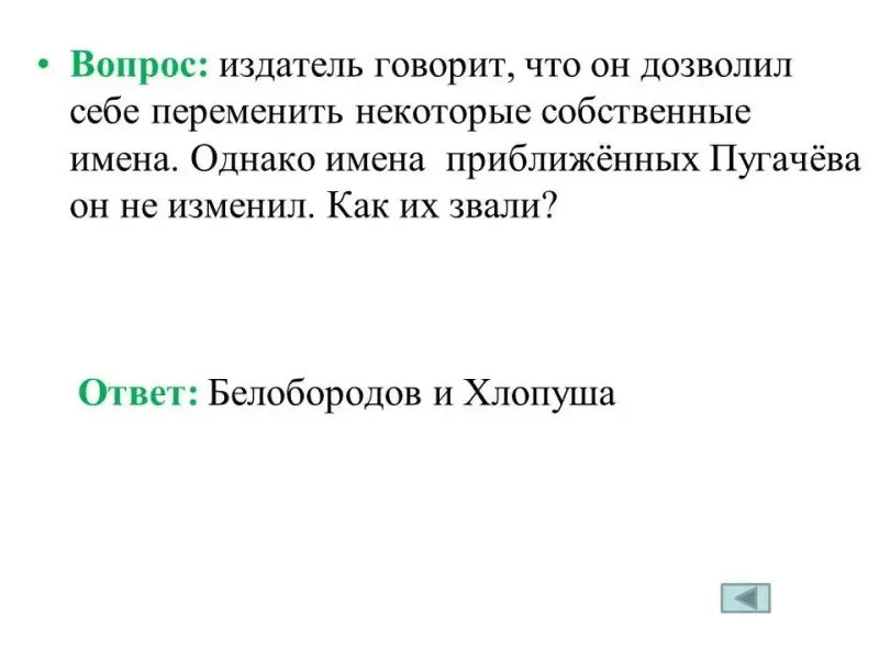 Вопрос: издатель говорит, что он дозволил себе переменить некоторые собственные имена. Однако имена приближённых Пугачёва он не изменил. Как их звали?