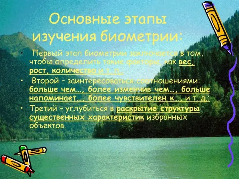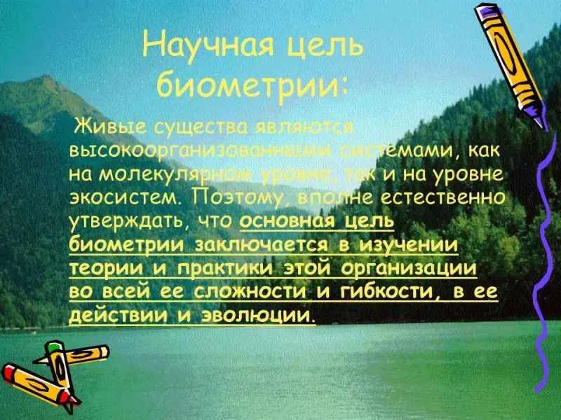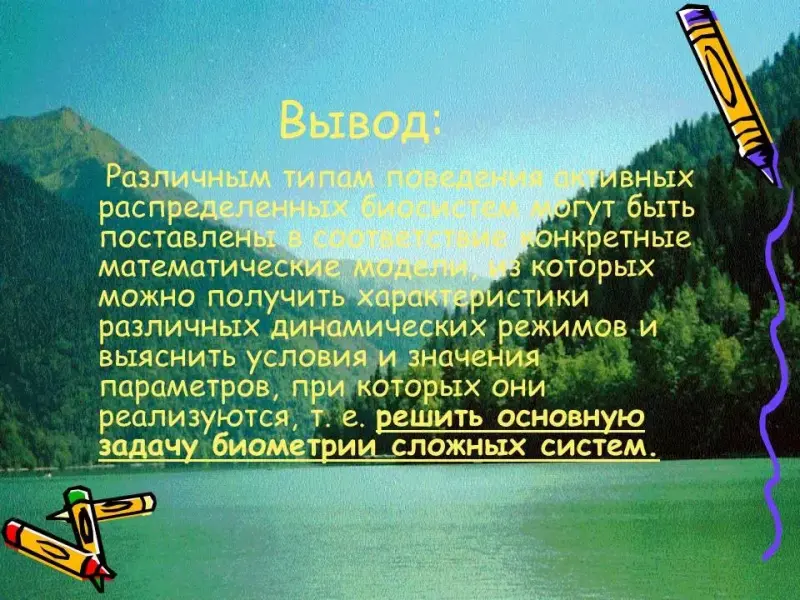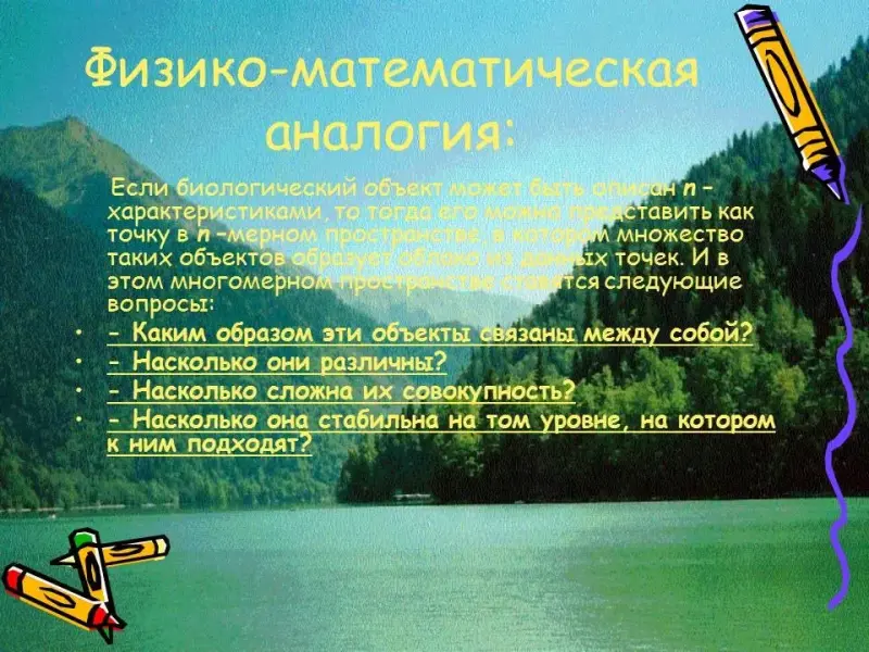 Резюмируем сказанное. Введение в математическую экологию неизбежно требует обращения к физике, химии, математике и информатике. Природные объекты являются высокоорганизованными системами, как на собственном структурном уровне, так и на уровне экосистем. Поэтому, вполне естественно утверждать, что основная цель математической экологии заключается в изучении теории и практики этой организации во всей ее сложности и гибкости, в ее действии и эволюции. И если вводный этап изучения заключается в том, чтобы определить такие факторы, как вес, рост, количество и т. п., то последующие - заинтересоваться соотношениями: больше чем…, более изменчив чем…, больше напоминает…, более чувствителен к…, и т. д., с тем, чтобы, в конце концов, углубиться в раскрытие структуры существенных характеристик избранных объектов. Дальнейшее развитие изложенных идей и принципов отражено в содержании элективного курса «Введение в биометрию» (См. Приложение 1).