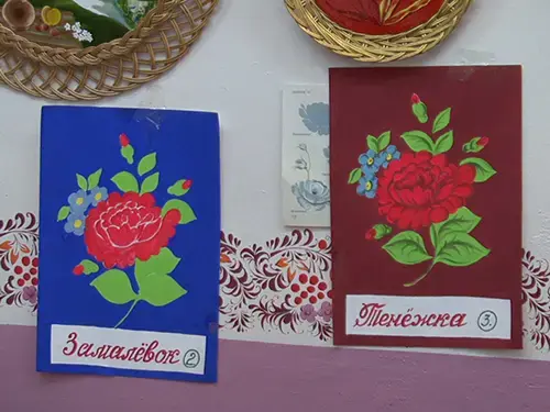Расписные изделия жостовских мастеров, открытки, таблицы с приёмами Жостовской росписи, поэтапное выполнение работы на фон по Жостовским мотивам. Панно в технике Жостово в лозе, сюжетные композиции в технике Жостово выпускников.