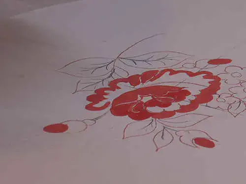 Начало и основа композиции будущего узора. Разбавленной краской на поверхности мы будем наносить силуэты цветов и листьев в соответствии со своим замыслом. Начнем тонировать с розы, т.к. роза - королева цветов. И в букетах жостовских мастеров она самая крупная, большая и пышная.
