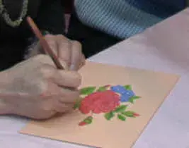 Приступаем к третьему - "Тенежку" - полупрозрачными красками мы наносим цветные тени. Слово "тенежка" созвучно слову "тень". У цветов появляется объем, обозначаются теневые места у лепестков, листьев.