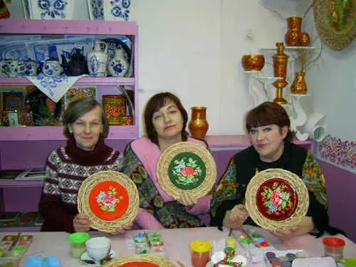 Перед вами имеются необходимые предметы для выполнения росписи: небольшие по форме картоны разного цвета и формы овальные, круглые и квадратные, оплетенные лозой заготовки в круге из фанеры. Получились необыкновенные изделия для украшения интерьера кухни. Еще перед вами имеются: наборы красок мастер-класса, палитры для размешивания красок, кисти колонок № 2,1.
