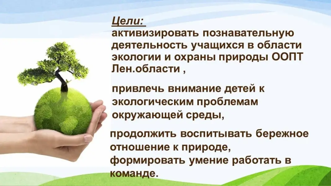 Цель: активизировать познавательную деятельность учащихся в области экологии и охраны природы ООПТ Лен.области , привлечь внимание детей к экологическим проблемам окружающей среды, продолжить воспитывать бережное отношение к природе, формировать умение работать в команде.