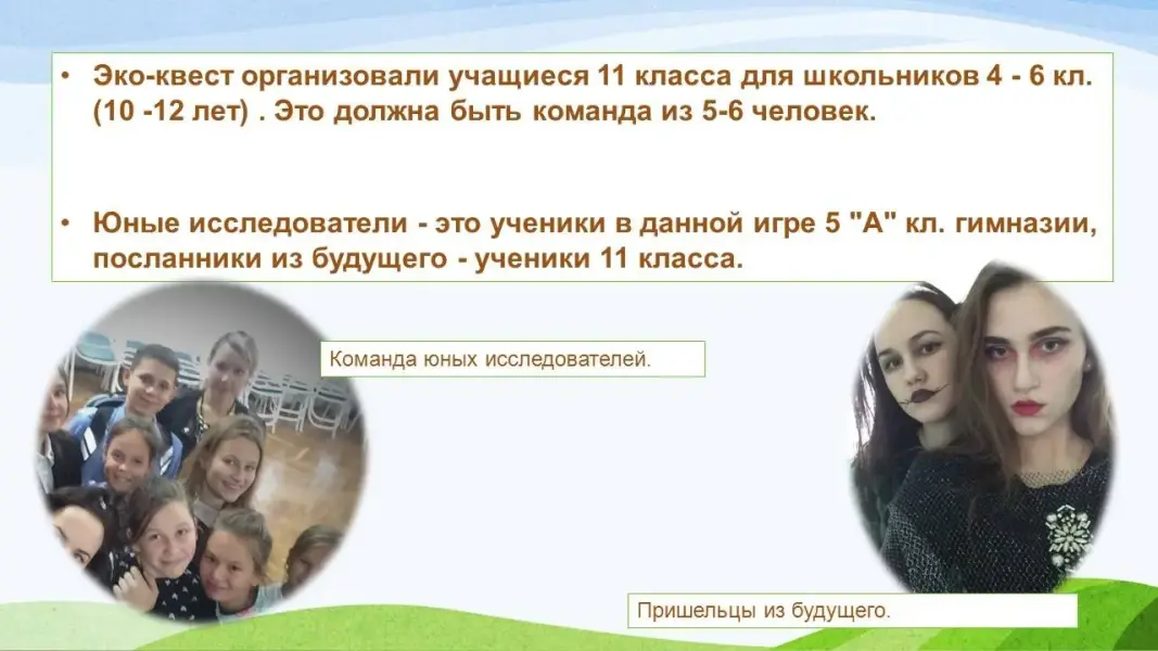 Юные исследователи - это ученики в данной игре 5 "А" кл. гимназии, посланники из будущего - ученики 11 класса.