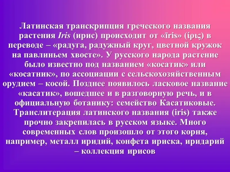 <Слайд2> Латинская транскрипция названия растения Iris (ирис) происходит от греческого и означает "радуга, радужный круг, цветной кружок на павлиньем хвосте". У русского народа это растение было известно под названием "косатик" или "косатник" в значении - "растение с листьями, похожими на косы", по ассоциации с сельскохозяйственным орудием - косой. Позднее появляется ласковое название "касатик", вошедшее и в разговорную речь, и в официальную ботанику: семейство Касатиковые. Транслитерация латинского "iris" также прочно закрепилась в русском языке. Много современных слов произошло от этого корня, например, иридарий - коллекция ирисов, иридология - отрасль медицины, связанная с названием радужной оболочки глаз, металл иридий, конфета ириска [2, 3].