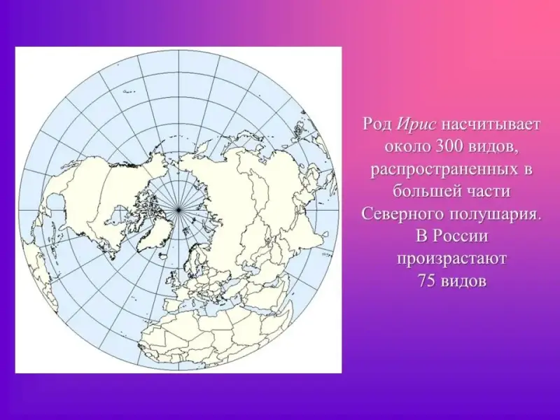 <Слайд4> Представители рода Ирис (семейство Касатиковые) распространены в большей части Северного полушария и насчитывают около 300 видов. На сегодняшнем уроке мы познакомимся с некоторыми из них [7].