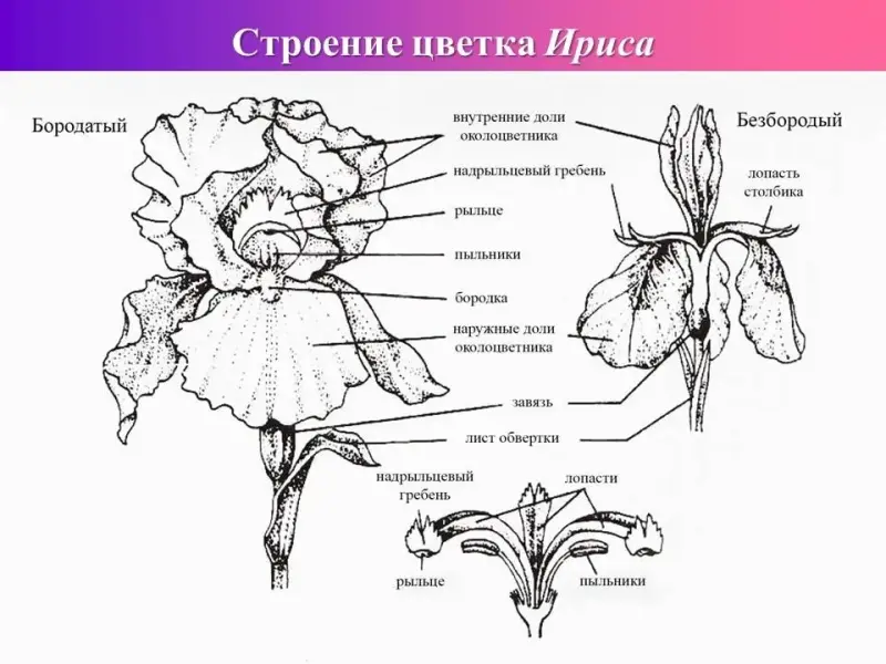 <Слайд5> Все многообразие видов ирисов можно разделить на две большие группы: бородатые и безбородые. Характерной особенностью является форма цветка, а именно - его двухъярусное строение из трех внутренних "лепестков", часто приподнятых вверх, и трех наружных, отогнутых вниз. Тычинки с пыльниками расположены внутри цветков под двойной защитой верхних лепестков и своеобразно устроенного пестика. Столбик пестика разделен на широкие лопасти, нависающие над пыльниками. На нижних лепестках некоторых ирисов расположены мягкие щетинистые выросты, напоминающие бородку и нередко принимаемые за тычинки [6].