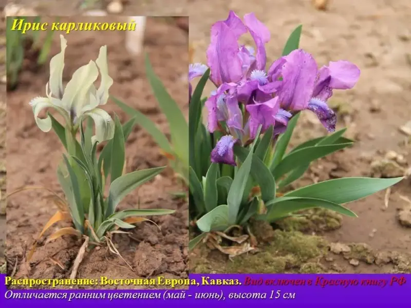 <Слайд7> В теплую солнечную погоду самым первым среди ирисов зацветает ирис (касатик) карликовый. Листья слегка сизоватые, короткие. Окраска цветков может быть самой разнообразной [6]. Этот вид включен в Красную книгу РФ.