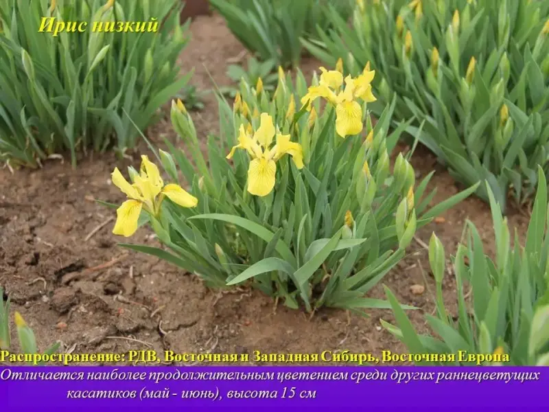 <Слайд8> Аборигенный вид Амурской области - ирис низкий. Листья сизо-зеленые, короткие. Отличается наиболее продолжительным цветением среди других раннецветущих ирисов. Вид включен в Красную книгу Амурской области.