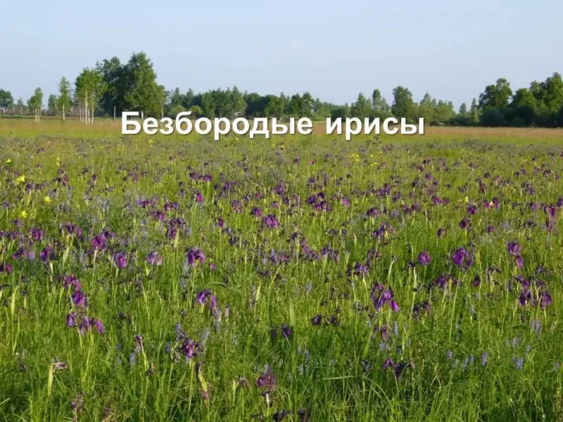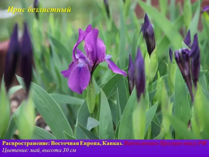 <Слайд9> Весной раньше листьев появляются цветоносы ириса безлистного, у которого к концу лета листва полностью отмирает - отсюда и название. Вид включен в Красную книгу РФ.