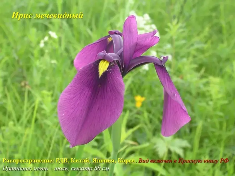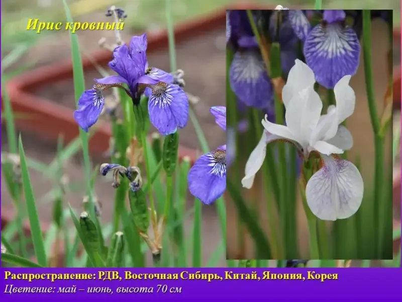 <Слайд15> Ирис гладкий в дикой природе произрастает на заболоченных лугах, берегах озер, болот. Листья широкие, вееровидные. Цветки крупные, ярко-синие с белой продольной полосой. Вид включен в Красную книгу Амурской области. Было время, когда это растение отождествлялось с луговым ирисом мечевидным <Слайд16>. Ирис мечевидный является экзотическим украшением любого сада - листья мечевидные, светло-зеленые, цветки бархатистые, пурпурно-фиолетовые, в основании с лимонно-желтым вытянутым пятном. Хорошо растет как на свету, так и в полутени, отлично развивается на переменно избыточно увлажненных участках. Этот вид включен в Красные книги России и Амурской области.