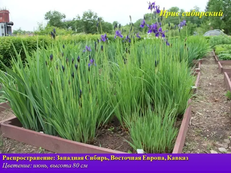 <Слайд12> Широко распространен вид - ирис сибирский. Листья узкие. Цветки значительно выше листьев. Цветки густо-фиолетово-синие. Со временем образует мощные кусты, что необходимо учитывать при посадке.