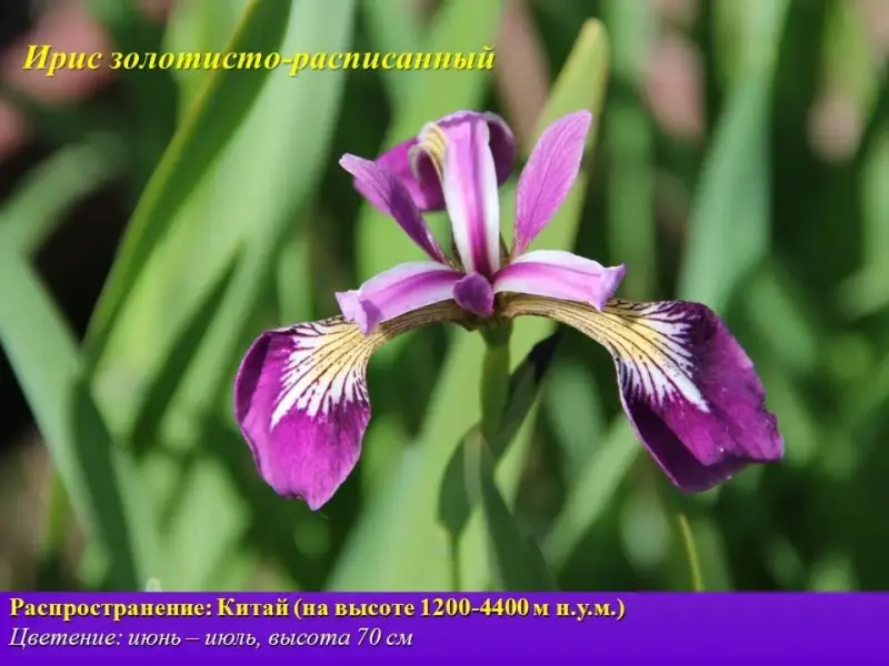 <Слайд13> Интересен китайский родственник дальневосточных сибирских ирисов, являющийся редкостью даже для ботанических садов - ирис золотисто-расписанный. Произрастает на влажных горных лугах, каменистых склонах или по краю леса в Китае на высоте 1200-4400 м н.у.м. Листья сизо-зеленые. Цветки бархатные, фиолетовые, со своеобразной росписью на наружных долях околоцветника, что придает им экзотический, легко запоминающийся облик.