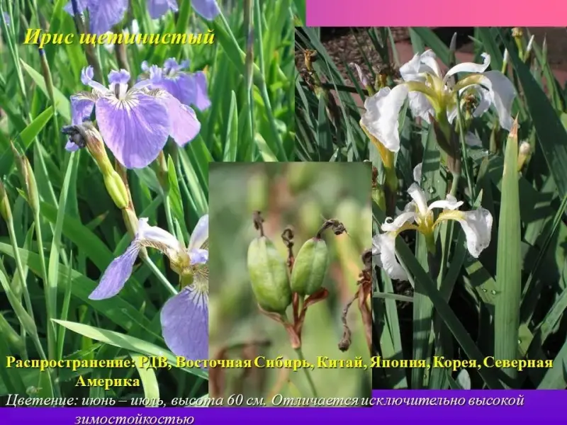 <Слайд14> Самыми неприхотливыми являются водолюбивые ирисы. Наш местный вид - ирис щетинистый растет по сухим и сырым лугам, берегам водоемов, в березняках, на открытых участках и в зарослях кустарников. Листья мечевидные, светло-зеленые. Цветонос ветвистый, выше листьев. Цветки светло-фиолетовые с мраморным рисунком. Самым ценным свойством этого ириса является необыкновенно высокая зимостойкость. В природе и культуре также встречается его белоцветковая форма.