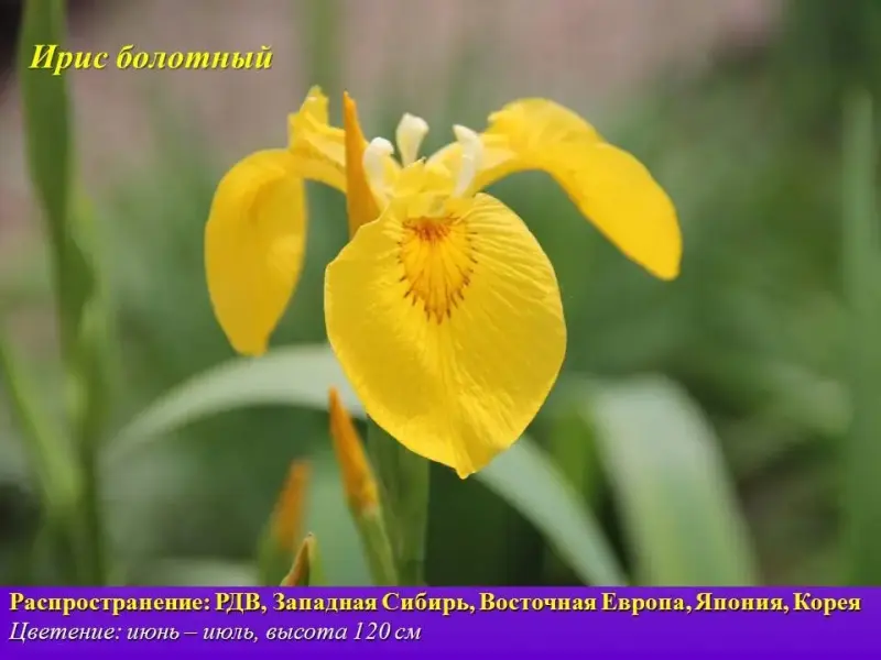 <Слайд17> Другой влаголюбивый ирис - ирис болотный. Произрастает по мелководьям рек, озер, болот. Листья мечевидные, широкие. Цветки крупные, золотисто-желтые с оранжево-коричневым пятном.