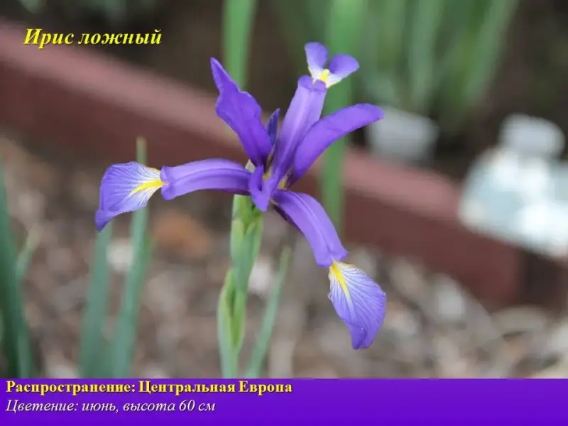<Слайд18> В цветоводческой литературе название группы закрепилось по самому распространенному виду - ирису ложному, который произрастает на засоленных почвах, в поймах рек, по берегам озер. Листья мечевидные, цветки сиреневые с фиолетовыми жилками и желтой сигнальной полоской.