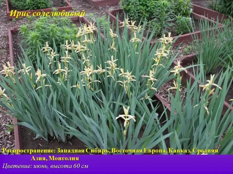<Слайд19> Широко распространенный вид - ирис солелюбивый, произрастает по долинам рек, в понижениях, среди степных кустарников. Листья мечевидные, цветки бледно-желтые. Особенно декоративен в период плодоношения.