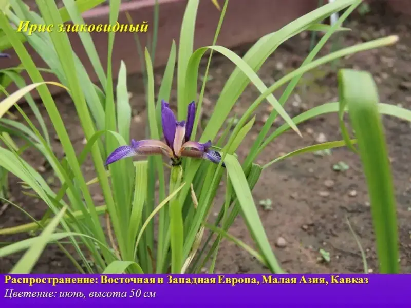 <Слайд20> Необычен ирис злаковидный. Произрастает среди кустарников на каменисто-щебнистых почвах, по сухим южным склонам. Листья густые, злаковидные, в верхней части поникающие. Цветки фиолетово-пунцовые.