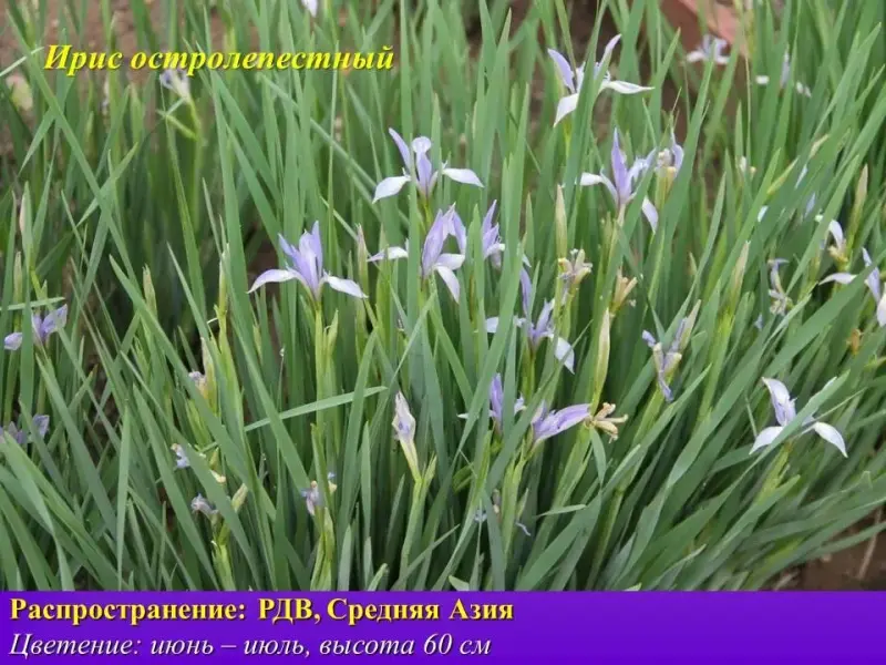 <Слайд21> У ириса остролепестного листья жесткие, узкие, сизовато-зеленые, бледно-лиловые цветки спрятаны в листве.