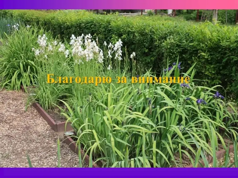 Учитель: Ребята, сегодня на уроке мы познакомились лишь с некоторыми ирисами, которые можно использовать при создании иридария - красивого цветника из ирисов. В качестве домашнего задания предлагаю вам составить цветочные композиции с использованием разных ирисов. Те, кто хотят внести свой вклад в создание школьного иридария, открою маленький секрет - растения можно вырастить из семян. За семенами можно обратиться в Ботанический сад.
