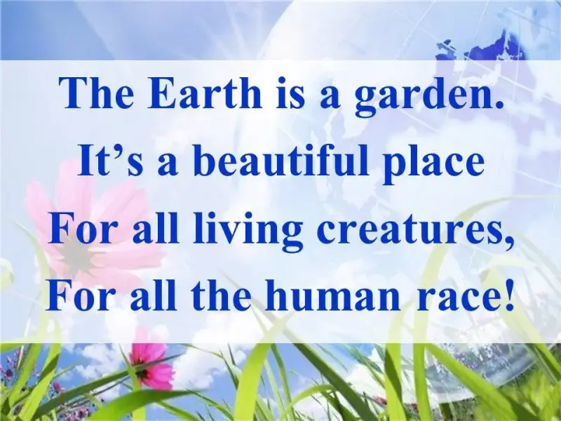 I. Урок-игра начинается с того, что класс делится на несколько групп. Каждой группе выдается по вырезанному из бумаги кругу, который символизирует землю, и разрезанные по принципу пазла фотографии животных, птиц, гор, морей и т.д. Ребята должны правильно и как можно быстрее собрать этот пазл. Когда пазл собран, учитель, используя наводящие вопросы, подводит учащихся к теме и целям урока, предлагает учащимся сказать, о чем они будут говорить сегодня. Когда тема определена учитель предлагает учащимся прочитать рифмовку TheEarthisagarden… (слайд 1).