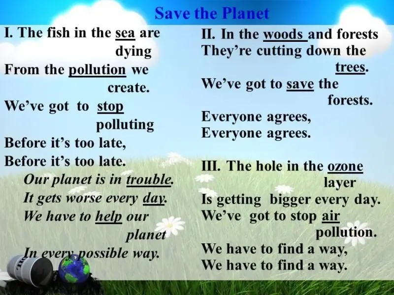 Работая с песней, учитель может предложить учащимся ответить на вопросы, например Whatecologicalproblemsarementionedinthesong? What causes these problems?