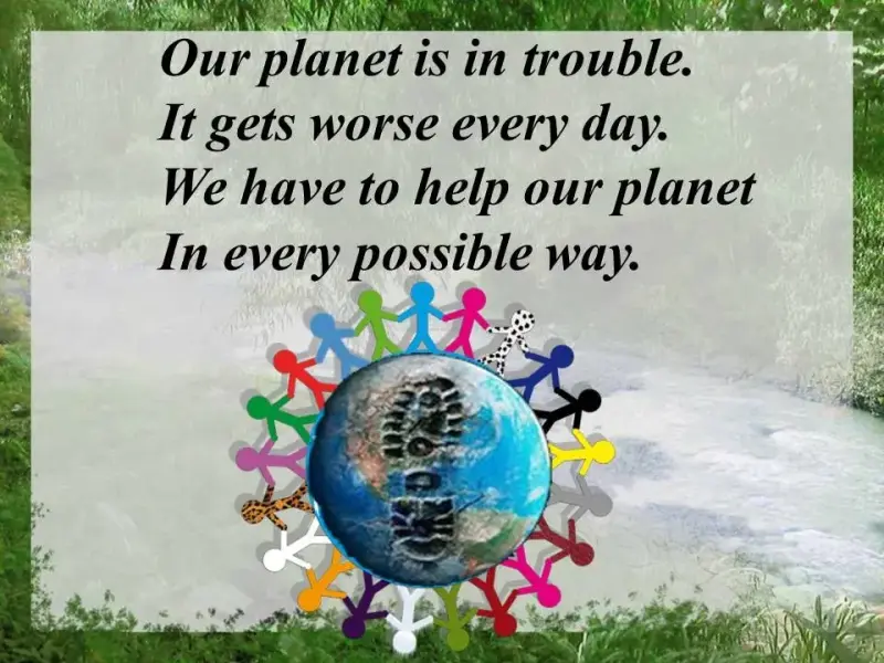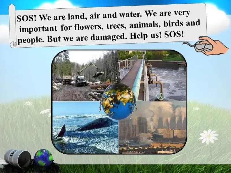 - SOS! We are land, air, and water. We are very important for flowers, trees, animals, birds and people. But we are damaged. Help us! SOS! (слайд 7)
