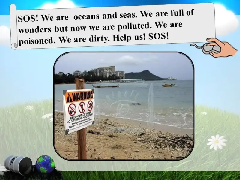 - SOS! We are oceans and seas. We are full of wonders but now we are polluted. We are poisoned. We are dirty. Help us! SOS!(слайд 9)