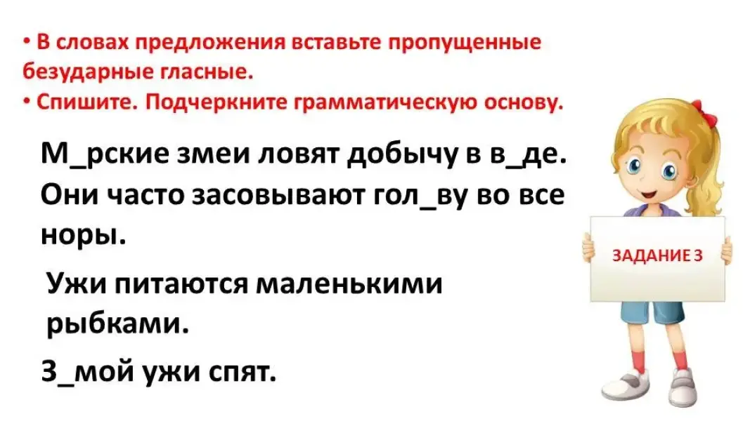 Напоминаю правила работы. - Перед вами предложение, в котором есть слова с безударными гласными. Ваша задача над словом надписать проверочное слово и вставить нужную букву. Время работы - 3 минуты. |